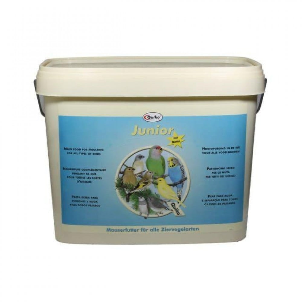 منتج Quiko Junior وهو عباره وجبة البيض الكامل (البياض والصفار ) و هو مخصص لموسم التبديل وللفراخ من عمر الفطام الى البلوغ وايضا الطيور المقبله على المشاركه بالمعارض وذلك بسبب ارتفاع نسبة البيوتين في هذا المنتج اذ تعتبر هي الداعم الاول لنمو ولمعان وصحة الريش وايضا يحتوي على اجود انواع الحبوب ومنها جبوب الكناري وحبوب الدخن الاصفر والاحمر وحبوب البريلا وحبوب الكتان وحبوب الخشخاش الازرق والنيجر والكينوا زائد القليل من الحشرات والروبيان ويتكون من البسكويت و والبيض والسكر والطحين والعسل مما ينتج فيتامينات