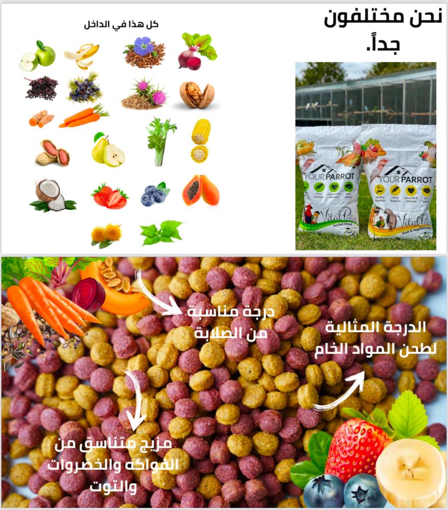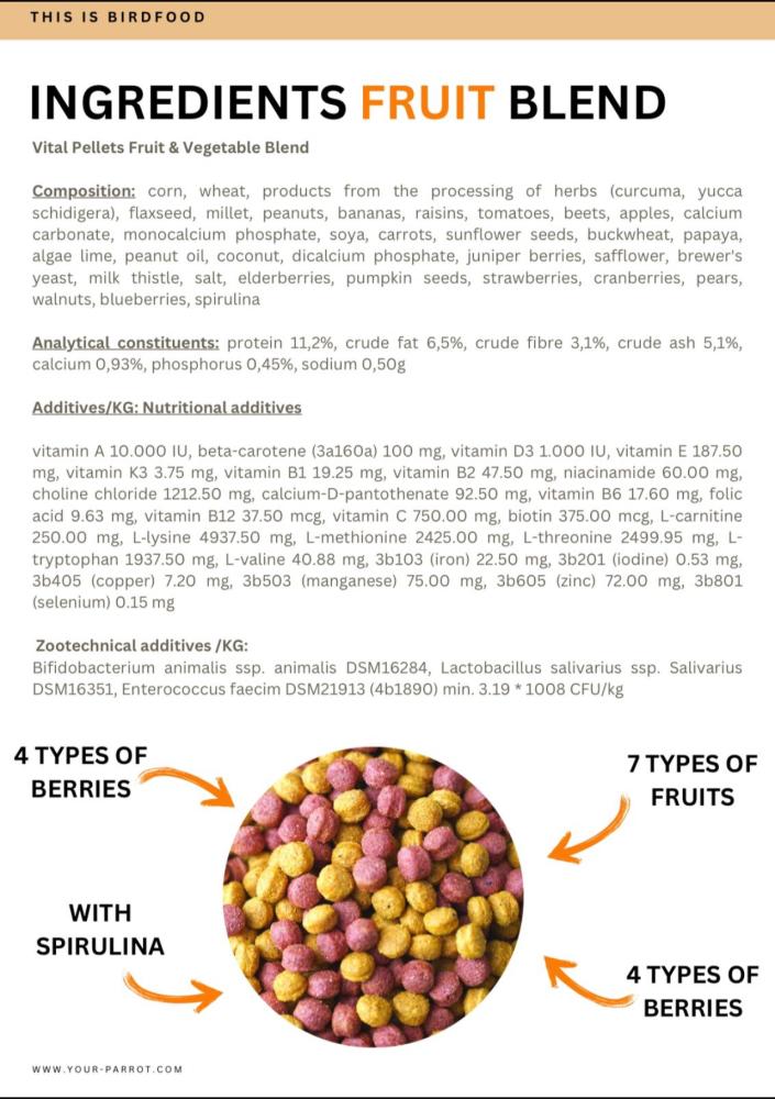 التركيب: الذرة، القمح، منتجات معالجة الأعشاب (الكركم، اليوكا شيديجيرا)، بذور الكتان، الدخن، الفول السوداني، الموز، الزبيب، الطماطم، البنجر، التفاح، كربونات الكالسيوم، فوسفات أحادي الكالسيوم، فول الصويا، الجزر، بذور عباد الشمس، الحنطة السوداء، البابايا، الطحالب، الليمون، زيت الفول السوداني، جوز الهند، فوسفات ثنائي الكالسيوم، توت العرعر، القرطم، خميرة البيرة، شوك الحليب، الملح، التوت البري، بذور اليقطين، الفراولة، التوت البري، الكمثرى، الجوز، التوت الأزرق، سبيرولينا